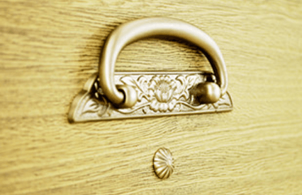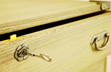 特徴的なのは、その精緻なつくりと、美しい木肌。 金具や引き出しの仕込みにもこだわり、長年の使用にも耐える堅牢さを備えています。